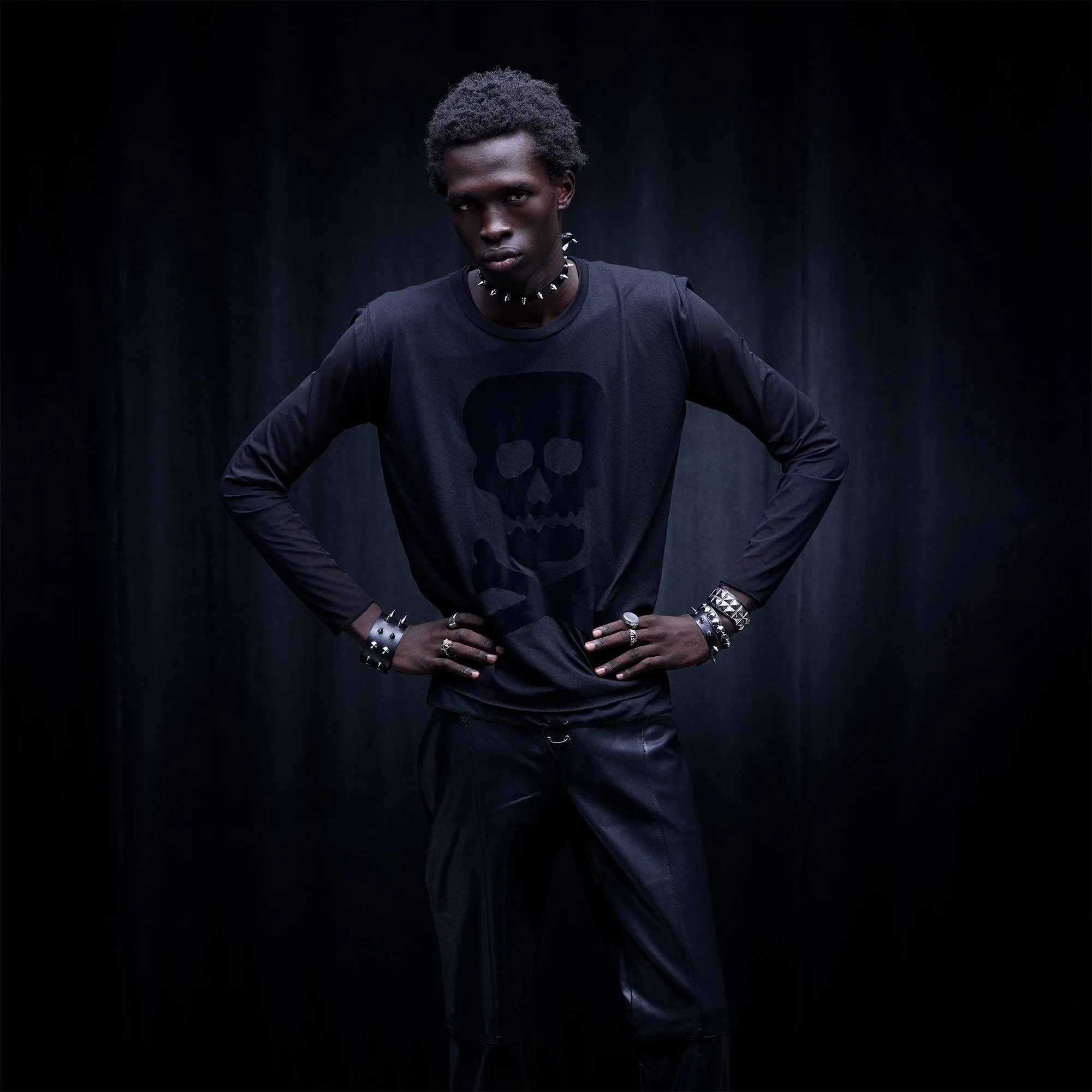 Das Demon Skull Damen-T-Shirt verfügt über ein beflocktes Design mit Totenkopf- und gekreuzten Knochen-Motiven auf der Vorderseite und dem ikonischen KISS-Logo auf der Rückseite des schwarzen Muscle-T-Shirts.