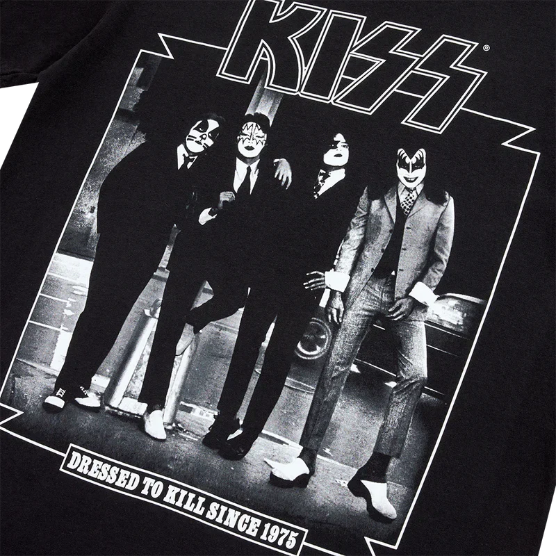 Das T-Shirt „Dressed To Kill Since 1975” zeigt das legendäre Albumcover und das KISS-Logo im Siebdruck auf der Vorderseite sowie die Titelliste auf der Rückseite.